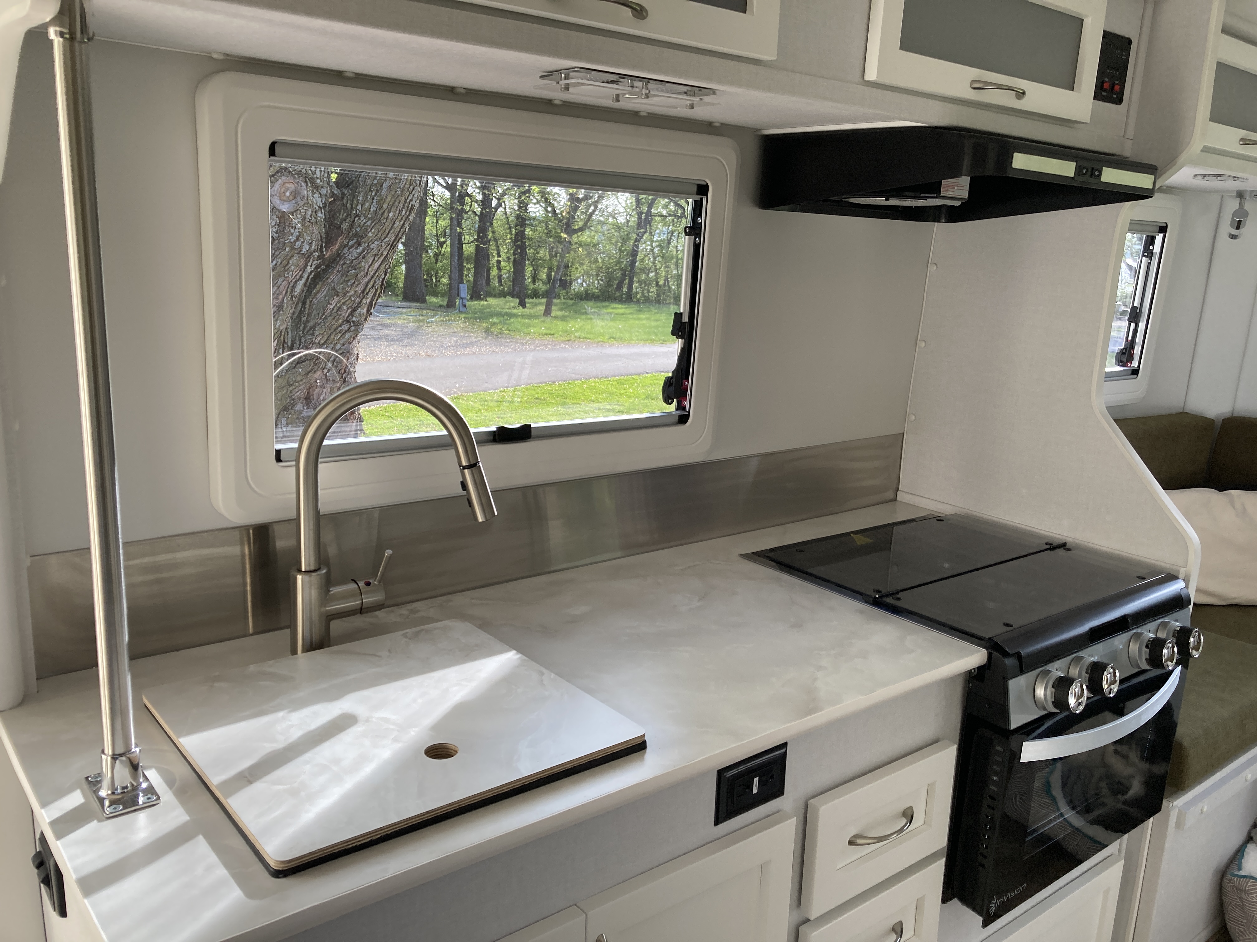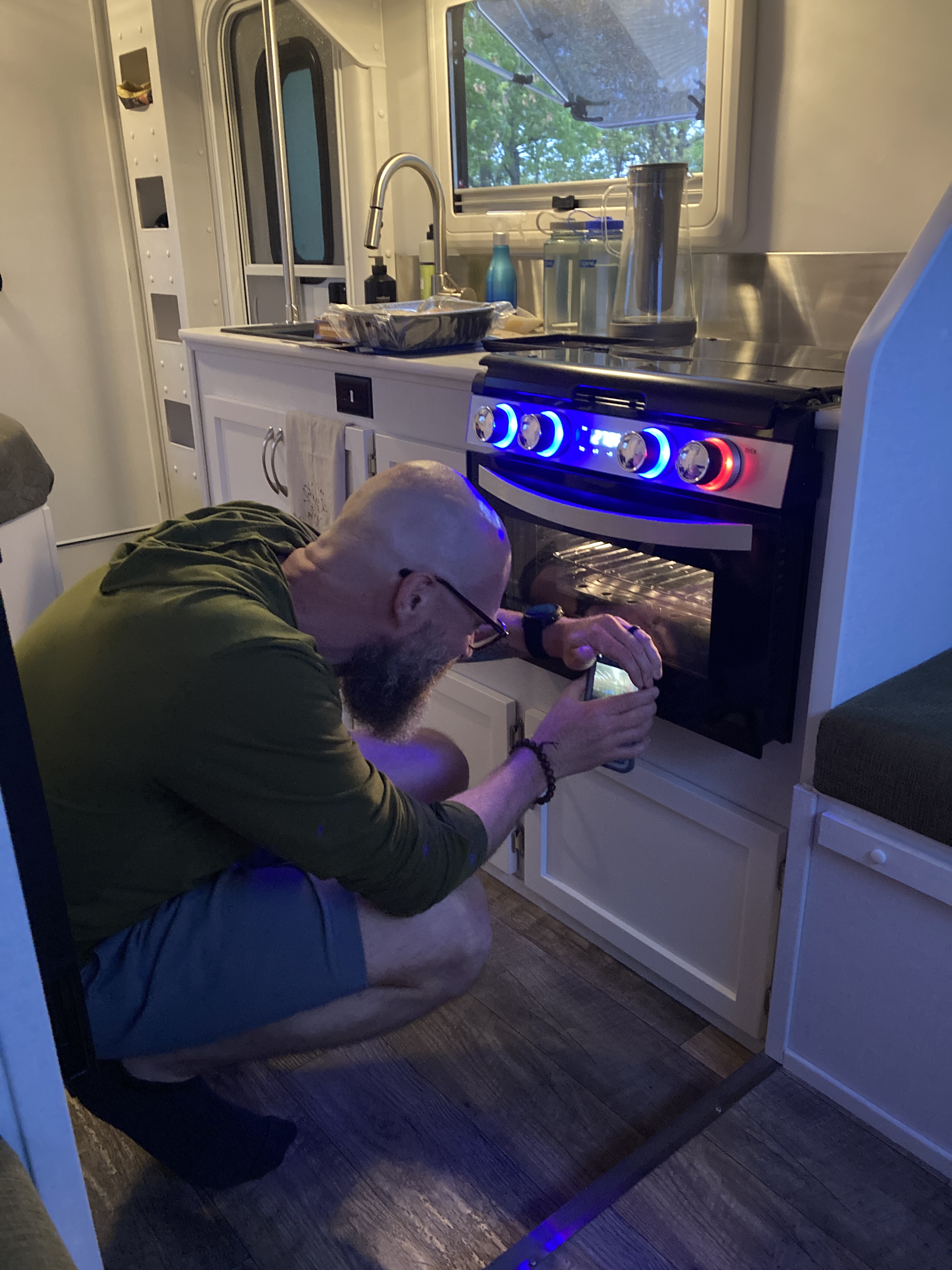 The first major appliance test came that evening when we fired up the small camper oven to bake our lasagna. Based on videos I’d seen online I began the process of lighting the oven’s pilot light with a match only to find out later it has a built in ignitor. Regardless, we got the oven started and it began preheating. We noticed the flames appeared small and the temperature was slow to rise and after waiting a while we began troubleshooting. For whatever reason the oven was stuck on a low setting but cycling through the oven temps one time kicked it into action and it preheated in about 5 minutes. Dinner was great and we enjoyed the rest of our evening inside.