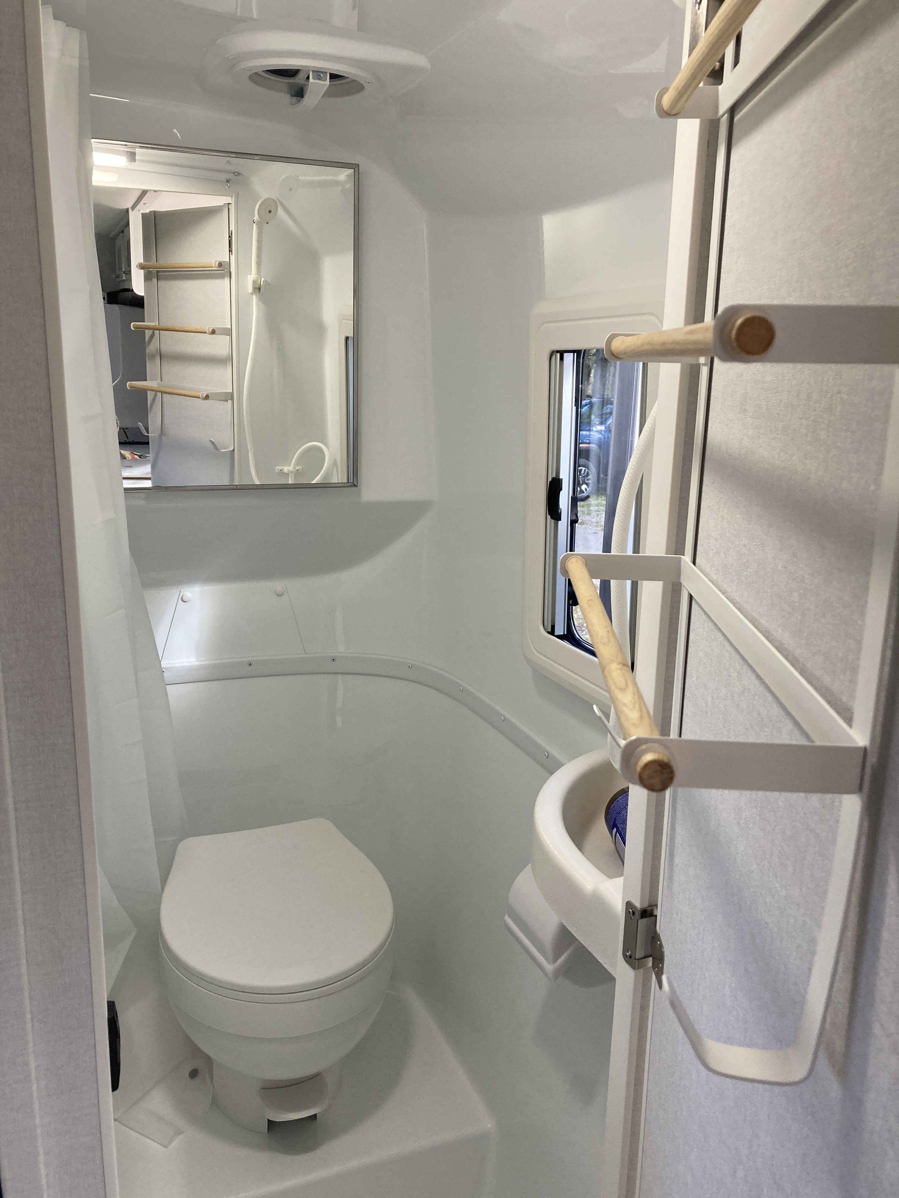 Morning saw us waking up far later than usual- the blackout shades worked very well. It also helped that it was overcast. The day would be cloudy, cool, and at times rainy. A perfect excuse to stay inside and putter around. We took advantage of the Houghton A/C’s built in heat pump which easily kept us warm all weekend. After a late breakfast we spent some time outside hiking and running. We were excited to try out the wet bath for the first time and found it to be plenty of space for a comfortable shower. We did learn that a towel to dry things off after will be a must.